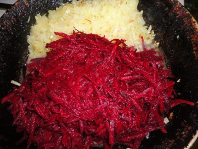 3. Свёклу натереть на крупной тёрке и добавить к луку. Тушить до мягкости свёклы. Посолите.
