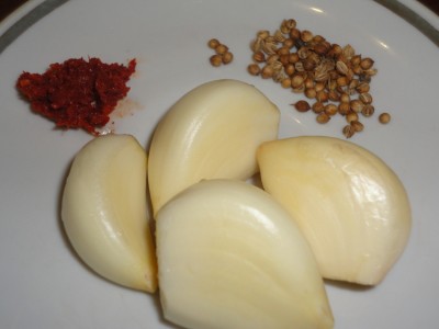 6. Пока тушится свёкла приготовьте специи - зубочка 3-4 чеснока, кориандр и 0. 5 чайной ложки аджики (можно больше)
