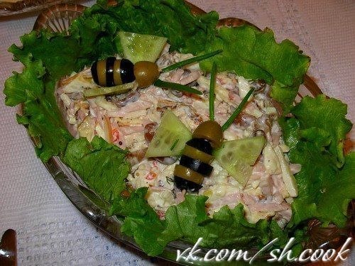 Салат «Мужской каприз» Ингредиенты: 0,5 кг мяса (говядины или свинины) 2 головки маринованного лука, 4 яйца 300 г твердого сыра Майонез