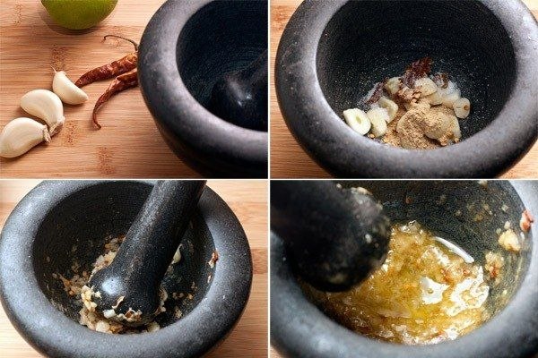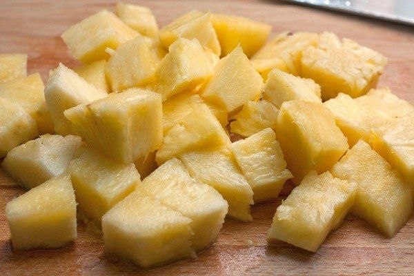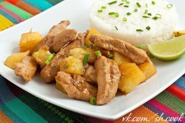Ингредиенты: Чеснок дольки 3 шт. Перец чили 1 шт. Имбирь молотый 1 ч.л. Соль ½ ч.л. Растительное масло 60мл Куриное филе 600г Ананасы ½ шт. Сахар темно-коричневый 60г Лаймы 1 шт.