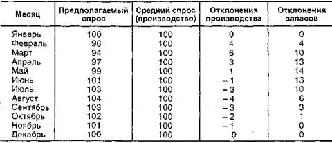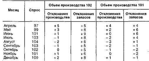 Мы видим, что стратегия производства производить 102 единицы приводит к перманентному перенакоплению запасов (что требует финансовых средств и связано с затратами хранения). Стратегия производить 101 единицу в месяц не всегда достаточна. С сентября по декабрь может возникнуть нехватка. Однако в этом случае удовлетворительное решение может быть достигнуто путем незначительного замедления отгрузки продукции, с тем чтобы избежать недоброжелательности потребителей. Если мы хотим избежать любой нехватки запасов, тогда необходимо минимизировать отклонения запасов вообще. С этой целью можно воспользоваться следующей стратегией: произвести 102 единицы в сентябре и октябре, 101 – в ноябре и 100 – в декабре. В любом случае мы могли бы затем оценить калькуляции обоих планов и посмотреть, который из них соответствует меньшим общим затратам.