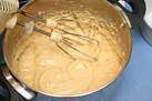 Этап 3. 3. Влить вино и 100 мл креветочного бульона, сливки, хорошенько размешать, довести до кипения. Добавить горчицу, соль, перец и готовить на медленном огне еще 5 минут. Снять с огня и дать немного остыть.