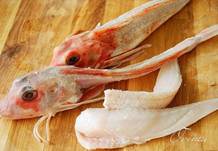 Этап 5. Филетируем морского петуха. Просто сверху острым ножом вдоль плавников прорезаем филе, а потом возле головы надрезаем и готово.