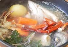 Суп буйабез - король супов! Это блюдо станет украшением любого праздничного стола. Этап 1. Традиционно рыбаки готовили этот суп из всей оставшейся рыбы, не проданной за день. Сегодня это один из самых дорогих супов. Причины понятны. Во-первых, рыба для него должна быть морской и свежей, во-вторых, в нём должно быть как минимум четыре, а лучше шесть сортов рыбы, не говоря о ракообразных, октопусах и т. д. Суп, приготовленный с соблюдением всех правил, готовится лишь в нескольких ресторанах Прованса, обычно сразу на большое количество персон, а стоимость порции иногда доходит до €150. Естественно, сегодня, если его готовят дома, то делают это по особым случаям. Я этот суп делал из таких продуктов: дорада, морской петух, морской окунь, лосось, крабы, креветки, мидии.