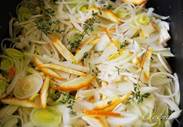 Этап 22. На оливковом масле чуть обжариваем чеснок. Добавляем порей, фенхель, тимьян, затем апельсиновые корки, помидоры.