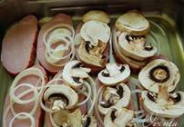Этап 7. В смазанную формочку для запекания выкладываем наше мясо, потом лук и затем грибы.