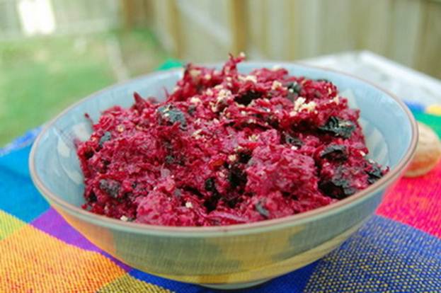 1 большая свекла 3/4 стакана чернслива (примерно 15 штук) 3/4 стакана грецких орехов 1 зуб чеснока 2 с.л. оливкового масла 1/2 ч.л. соли
