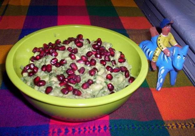 5 спелых авокадо (немного мягких, мякоть должна быть как сливочное масло, зелёного цвета, без коричневых пятен - коричневые пятна можно отрезать) совсем немного лука - некоторые любят побольше, но я нерекомендую больше четвертинки небольшой луковицы 2 небольших помидора сок одного лайма (или лимона) чайная ложка мелко нарезанного острого перца халапено, семячки вынуть пучок кинзы 1 ч.л. соли, можно больше на вкус 1 стакан гранатовых зёрен