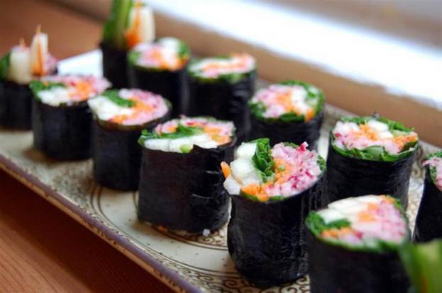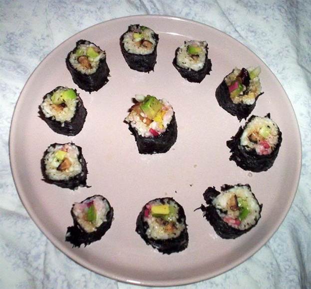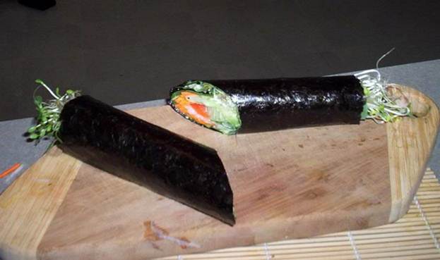 редиска дайкон морковка огурец зелёный лук водоросли нори соевый соус ростки клевера сладкий перец авокадо листья колларда (кормовой капусты; сухие салатные листья тоже подойдут)