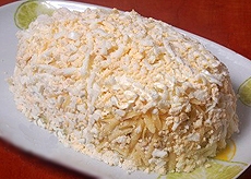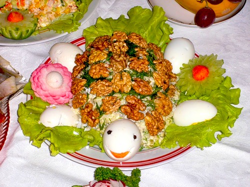 Приготовление Блюдо выложить листьями салата и на них слоями выложить ингредиенты. Другой вариант украшения салата «Черепаха» Салат «Ананас»