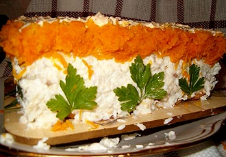 Приготовление Все ингредиенты начинки смешиваются, и получается довольно жидкая масса, которой затем пропитаются слои хлеба. Можно по вкусу добавить молотые пряности. Закусочный торт