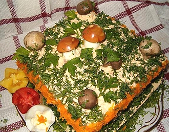Ингредиенты: • 1 кг свежих грибов (или замороженных, или консервированных) Для маринада: • 3-4 ст. ложки сладкой острой горчицы • 1 ст. ложка мёда • 5-6 зубчиков чеснока • петрушка, тимьян, укроп, черный перец и др. по вкусу • 50 мл растительного масла • 1 ст. ложка 9% уксуса • 1/2 ч. ложки соли Ингредиенты: • упаковка готового слоёного теста (или приготовить пресную слойку) • 500 г шампиньонов свежих • 200-300 г моркови (3 шт. средние) • 5 яиц • 200 г рыбного филе окуня (2 шт.) • 1 большая луковица • по пучку укропа и зеленого лука • 100 г сыра с плесенью (Дорблю) • 200 г творожного сыра (Альметте) • петрушка • 2 перепелиных яйца для украшения Для начинки: • 2 банки консервов «Тунец в собственном соку» • майонез – 4 десертных ложки • плавленый сыр натертый – 3 десертных ложки • мелко нарезанный укроп Бутербродный торт Закусочные торты