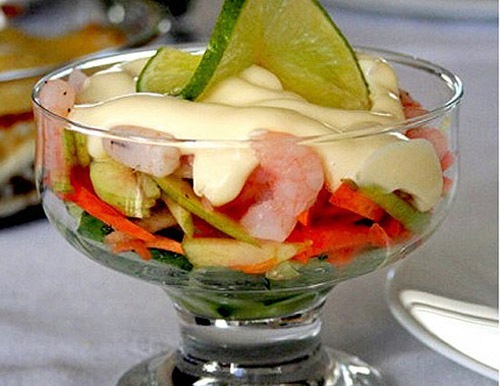 Ингредиенты: Креветки отварить в специях (лавровый лист,чёрный перец горошком,соль). Порционный салат «Коктейль из креветок»