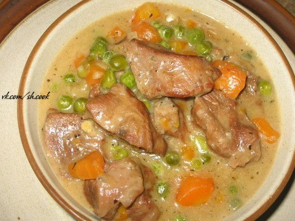 Тушить на маленьком огне 1 час. Добавить зеленый горошек и потушить еще 10 минут. Добавить сметану, помешать, посолить по вкусу, потушить 10 минут.