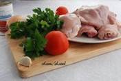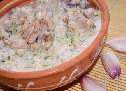 куриное мясо (можно с костями) 400 гр, лук 2 шт (100 гр), чеснок 5 зуб, мука 1 ст. ложка, молоко 50 мл, сметана 4-5 ст. ложки, вода или бульон 150-200 мл, зелень, соль и перец по вкусу, хмели-сунели 1/2 ч. ложки, тмин 1/3 ч ложки, сахар 1/2 ч ложки.