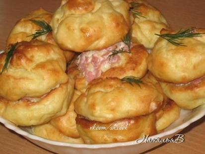 В кастрюле воду и сливочное масло довести до кипения, добавить соль, всыпать муку и на медленном огне заварить тесто, быстро мешая, пока тесто не начнет отставать от стенок кастрюли. Слегка охладить и соединить с картофельным пюре, затем вбить яйца и слегка взбить блендером. Затем картофельную массу чайной ложкой в виде шариков выложить на противень, застеленный пергаментом. Выпекать в разогретой до 220градусов духовке 20 минут. Для начинки: ветчину, лук мелко порезать - обжарить на раст. масле, охладить; сыр порезать мелким кубиком. Соединить ингредиенты, посолить и заправить майонезом или сметаной. Охлажденные профитрольки слегка продавить с нижней стороны и заполнить начинкой(внутри они получаются полые), можно слипить попарно. При подаче украсить зеленью. Приятного аппетита!