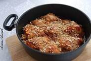 Курицу с соусом закрыть крышкой и тушить на очень слабом огне около часа. За несколько минут до окончания приготовления осторожно перемешать содержимое сковороды и добавить пряные травы (можно взять свежие или сушеные).