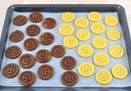 Остатки светлого теста опять слепить в шар, раскатать и так далее. Точно также поступить с темным тестом. Поддевая лопаткой или ножом, переложить все кружки на противень, застеленный пекарской бумагой. Поставить в разогретую до 180 градусов духовку. Выпекать примерно 20 минут.
