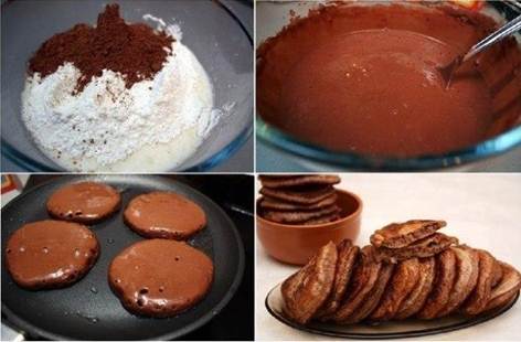 Смешиваем сначала стакан с лимонным соком, сахаром и яйцами, а потом добавляем все остальное — муку, соду и какао-порошок. Перемешиваем тесто до однородности. Оно должно получиться довольно густой консистенции. Тесто не должно долго стоять, так что сразу приступаем к жарке оладий. На хорошо разогретую сковороду наливаем масло и жарим оладьи на довольно большом огне с обеих сторон. В процессе жарки они должны хорошо подниматься и оставаться пышными даже после того, как остынут.