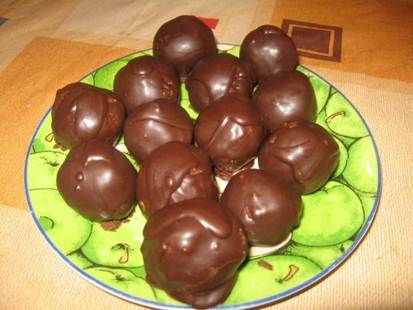 Приготовление: 1. Сухари измельчить и перемешать с какао 2. Закипятить молоко,дать ему слегка остыть(чтобы было тёплым)добавить в него масло,сахар и ваниль,и размешать до растворения сахара 3. Всыпать в молочную смесь сухую и хорошо перемешать,добавить сгущёнку,ликёр и орехи и ещё раз хорошо перемешать 4. Убрать в холодильник на 1 час.Через час достать,брать чайной ложкой и скатать небольшие шарики 5. Глазурь:Всё растопить на вод.бане Кидаем шарик в глазурь по одному и аккуратно достаём подцепив вилкой,выкладываем на кальку и в морозилку на 20 мин.