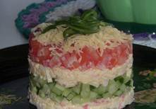 Салатик с крабовыми палочками Ингредиенты: Крабовые палочки-100 гр. Яйцо вареные-1 шт. Свежий огурец, Помидор, Сыр-30 гр. Майонез-2 стол.ложки. Приготовление: 1.Смешиваем измельченные продукты:крабовые палочки+яйцо+майонез. 2.Укладываем слоями:палочки,огурец,палочки,помидор,сыр.Украшаем!