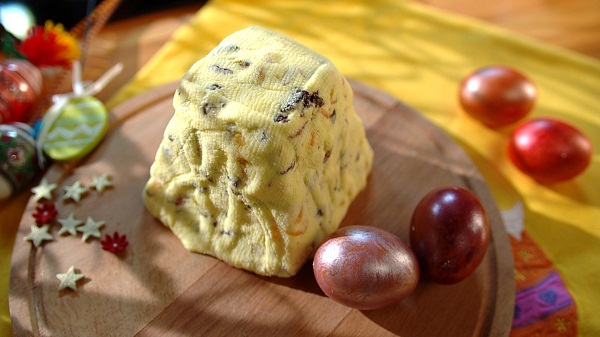 Ингредиенты: Шафран — щепотка Теплая вода — 1 ст.л. Маскарпоне — 250 г Рикотта — 250 г Творожная масса — 250 г Курага — 50 г Чернослив — 50 г Миндаль — 50 г Изюм — 50 г Горький шоколад — 50 г Жирные сливки — 80 мл Приготовление: В миске смешать рикотту, маскарпоне и творожную массу. Порубить курагу, чернослив и миндаль. Шафран развести в ложке теплой воды. Сливки взбить до сметано образного состояния. В творожную смесь добавить миндаль, сухофрукты, шоколад и шафранную воду. Перемешать и аккуратно ввести взбитые сливки. В форму для пасхи положите марлю, выложите творожную смесь и положите под гнет на несколько часов.