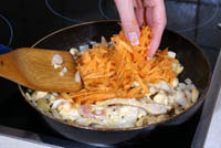 Мясо нарезать небольшими кусочками. Разогреть в сковороде сливочное масло, добавить курицу и готовить до исчезновения розового цвета. Добавить мелко нарезанный лук, готовить, помешивая, до прозрачности лука. Теперь можно добавить натертую на крупной терке морковь. Готовить все вместе до готовности морковки. Приправить по вкусу солью и сухим шалфеем. Добавить треть тертого сыра и все перемешать.