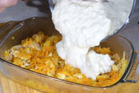 Посыпать тертый сыром и запекать при 200С примерно 20 минут, пока не расплавится и не зарумянится сыр. Запеканка готова.