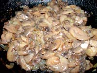 Шампиньоны обтереть влажной салфеткой и нарезать тонкими ломтиками. Лук почистить и порезать маленькими кубиками. Разогреть масло, потушить в нем грибы и лук, добавив соль, перец, сахар и несколько капель лимонного сока. Грибную массу быстро уварить на сильном огне, часто помешивая. Как только грибы начнут поджариваться, снять сковороду с огня.
