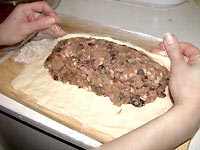 Оставить немного теста для украшения рулета. Пласт слоеного теста (30х25 см) уложить на пленку, на тесто по всей длине выложить начинку, сформованную в валик. С помощью пленки свернуть рулет, смазать край яйцом и прижать получившийся шов. Переложить рулет швом вниз на противень (или форму), предварительно смазанный маслом.
