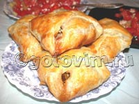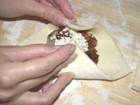Края квадрата смазать белком, чтобы при выпекании не вывалилась начинка. Завернуть начинку в конвертик. Конвертик смазать яйцом и сливочным маслом.
