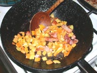 Болгарский перец нарезать кубиками, обжарить до мягкости вместе с мелко нарезанными луком-пореем и беконом. Добавить измельченный чеснок.