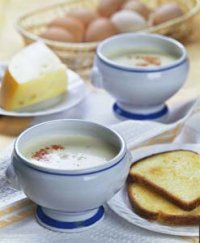 Что делать: Очистить лук, мелко порубить и припустить в кастрюльке со сливочным маслом до мягкости, но не давая поджариться до красного цвета, иначе будет чувствоваться запах жареного лука. Залить молоко, вскипятить, сделать слабый огонь и проварить в течение 3–4 мин. Протереть массу сквозь частое сито, слить содержимое в небольшую кастрюлю, посолить и еще раз вскипятить. Сыр натереть на мелкой терке. Смешать желтки, сливки и тертый сыр, заправить суп этой смесью, добавить перец и еще раз перемешать. Поджарить на сливочном масле ломтики белого хлеба с двух сторон. Разлить суп по тарелкам, подать с приготовленными гренками.