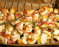 Промыть рыбу и просушить бумажным полотенцем. В ступке истолочь листки розмарина с чесноком, добавить оливковое масло. Нарезать рыбу кубиками примерно 5х5 см. и обвалять ее в масле с чесноком и розмарином. Срезать с хлеба корки и поломать на небольшие кубики. Насадить на шпажку вперемешку кусочки батона и рыбы. Застелить противень бумагой для выпечки, уложить на него шашлычки из рыбы и хлеба, сбрызнуть оставшимся оливковым маслом и розмарином, положить сверху шпажек полосочки бекона. Запекать в разогретой до 200 С духовке 15-20 минут.