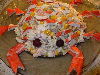 ИНГРИДИЕНТЫ Крабовые палочки – 200 г, кукуруза – полбанки (400 мл), огурцы маринованные – 3 шт., яйца – 3 шт., лук репчатый – 1 шт., масло растительное для жарки, майонез. ПРИГОТОВЛЕНИЕ Благодаря двум добавленным ингредиентам, этот, казалось бы, всем давно известный салат, заиграл новыми вкусовыми ощущениями. Попробуйте и убедитесь сами! Подготовить ингредиенты для салата. Яйца отварить, порезать кубиками. Палочки порезать некрупно отложив 3-4 штуки для украшения. Лук нашинковать тонкими полукольцами, обжарить до золотистого цвета в небольшом количестве растительного масла. Остудить. Огурцы порезать мелкими кубиками, слегка отжать их от лишней жидкости. С кукурузы слить жидкость. Смешать ингредиенты для салата в глубокой миске. Заправить салат майонезом, при необходимости – подсолить. Выложить салат на большое плоское блюдо в форме купола – это будет туловище краба. Из оставленных палочек вырезать клешни краба, из ягод смородины или половинок маслин сделать глаза краба. Сверху сделать панцирь из оставшихся кусочков крабовых палочек и кукурузы. Подавать салат можно сразу же. Салат "Смертельный номер"