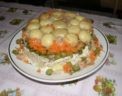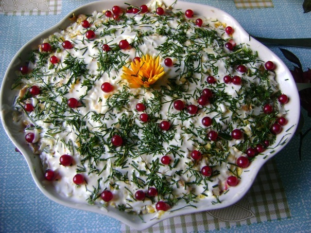 ПРИГОТОВЛЕНИЕ Все выкладывается слоями, промазывается майонезом. Сверху посыпать сыром, промазать майонезом и украсить по желанию (ягоды смородины или брусники - по сезону)