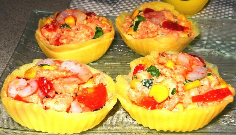 ПРИГОТОВЛЕНИЕ Сыр тонко порезать, а проще взять готовую нарезку (например Ольттермани). Положить пластинки сыра на пергамент и поставить в микроволновку на полную мощность на 5-7 секунд, чтобы сыр стал очень мягким, но не расплавился. Полученные сырные кусочки заложить в формочки (можно просто на перевернутый стакан) и оставить на некоторое время. За это время взбить в блендере творог+йогурт+кетчуп+соль+приправу для морепродуктов. Креветки и черри порезать на средние кусочки, добавить туда кукурузу и порвать рукколу. Всё смешать с заправкой и распорционировать в сырные корзинки. До подачи держать в холодильнике.