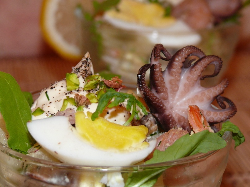 ИНГРИДИЕНТЫ 400 гр морского коктеля (мидии, креветки, осминоги, кальмары) 200 гр консервированого ананаса кусочками, 4 больших вареных яйца свежая руккола 30 гр жареных фисташек 200 гр любого твердого сыра (у меня гауда)