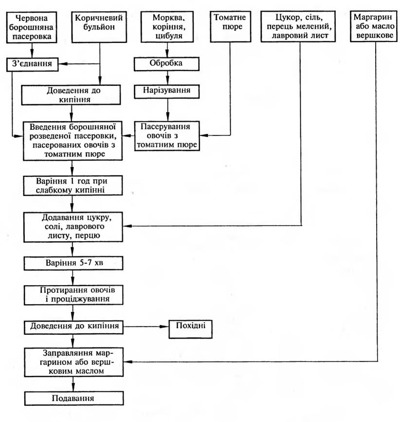 Норми закладання продуктів наведено з розрахунку на 1 л бульйону або на 1 кг готового соусу. Розрізняють червоні і білі соуси на м'ясному бульйоні. Червоні соуси мають яскраво виражений гострий смак, а білі — ніжніший. Основою червоних соусів є коричневий м'ясний бульйон і червона суха борошняна пасеровка. В ці соуси додають пасеровані ріпчасту цибулю, моркву, біле коріння, томатне пюре і спеції. Соус червоний основний (рис. 121). Нарізані ріпчасту цибулю, моркву, петрушку пасерують з жиром, додають томатне пюре, пасерують ще 10-15 хв. Рис. 121. Технологічна схема приготування соусу червоного основного. Охолоджену до температури 70-80 °С борошняну червону суху пасеровку розводять теплим бульйоном у співвідношенні 1:4, ретельно перемішують до утворення однорідної маси. Коричневий бульйон, що залишився, доводять до кипіння і вливають у нього розведену пасеровку, кладуть спасеровані з томатним пюре овочі і варять протягом 1 год при слабкому кипінні, періодично помішуючи. Під час варіння крохмаль борошна клейстеризується, соус стає в'язким. За 10-15 хв до закінчення варіння додають сіль, цукор, лавровий лист, мелений перець. Для поліпшення смаку можна додати соус Південний і м'ясний сік. Потім соус проціджують крізь сито і протирають розварені овочі, знову доводять до кипіння для стерилізації і збільшення терміну зберігання.