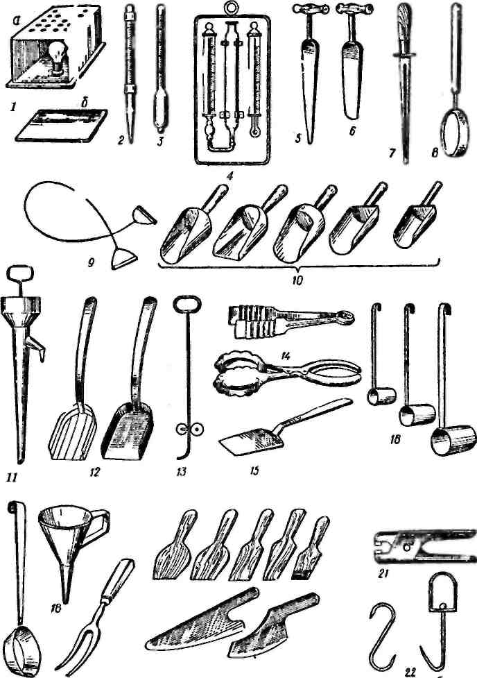 97 19 20 Рис. 2. Інструменти й інвентар складських приміщень: / — овоскоп: а — знімна кришка з гніздом для яєць; б — молочне скло для перевірки пляшок з вином; 2 — термометр з металевим наконечником; 3 — ареометр; 4 — психрометр; 5, б, 7 — пробовідбірники для масла, сиру, борошна і круп; 8 — лупа; 9 — струна для нарізування масла; 10 — совки; 11 — насос для олії; 12 — лопати дерев'яна і решітчаста для картоплі; 13 — пристрій для переміщення бочок; 14 — щипці кондитерські; 15 — лопатка кондитерська; 16 — молокоміри; 17 — ложка для сметани; 18 — лійка; 19 — вилка для оселедця; 20 — лопатки для сиру, топленого масла, ікри, повидла, для обчищання бочок; 21 — пломбір; 22 — гаки для м'яса: а — "вісімка"; б — "вертлюг".