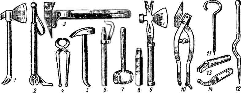 Рис. 3. Інструменти для відкривання тари: / — сокира-молоток; 2 — лапка; 3, 5 — молоток-лапка; 4 — обценьки; 6 — знімач обручів з бочок; 7 — дерев'яний молоток; 8 — набійник дерев'яний; 9 — томагавк; 10 — лапка-ножиці; // — прут для відкривання тари; 12 — фігурний важіль; 13 — набійник металевий; 14 — ніж для розпорювання мішків. * Зберігайте дині та кавуни при температурі 3-5 °С на решітчастих полицях стелажів в один ряд, щоб вони не торкалися одне одного, хвостиками догори. Штабельний спосіб придатний для продуктів у тарі на підтоварниках (плоди, овочі, птицю — в ящиках, крупи, борошно, цукор — у мішках). Штабелі розташовують так, щоб була колова циркуляція повітря. Насипним способом зберігають овочі без тари в бункерах, ящиках — клітках, засіках навалом 1,5 м заввишки. Наливний спосіб використовують для зберігання рідких продуктів: олії, сметани, молока, які надходять у бочках, бідонах. Підвісним способом зберігають м'ясо, яке охололо і охолоджене, копчені м'ясні вироби, варені ковбаси, сосиски, сардельки. їх розміщують так, щоб вони не торкалися між собою і до стін. При зберіганні в продуктах відбуваються фізичні, хімічні, біохімічні і біологічні *3берігайте банани при температурі не нижче 10 °С: при нижчих температурах вони потемніють, погіршується їх смак. Фізичні процеси — це зміна температури, вологості продуктів, поглинання ними газоподібних речовин, ущільнення і деформація. Наприклад, при високій температурі (20-25 °С) і пониженій вологості овочі і фрукти в'януть, висихають, втрачають масу. Хімічні процеси спричинюють утворення нових речовин, які погіршують харчову цінність, смак, запах і колір продукту. Так, при підвищеній температурі під дією природного світла жири окислюються (гіркнуть), томатна паста темніє, картопля зеленіє і в ній накопичується соланін. Біохімічні процеси проходять під дією ферментів, що містяться в продуктах. До них належать дихання і гідролітичні процеси.