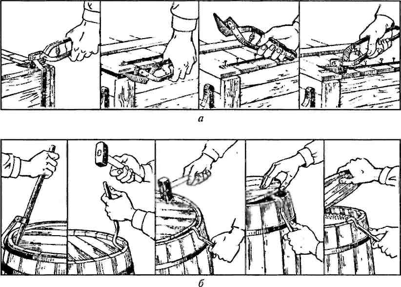 Рис. 4. Способи відкривання тари: а — ящиків; б — дерев'яних бочок. монту, не потребує ремонту, тара-брак, тара-матеріал). Ящики і бочки зберігають штабелями на підтоварниках заввишки не більше 2 м. Тару, що має специфічний запах (оселедців, риби), зберігають окремо. Мішки витрушують, просушують, зашивають (якщо потрібно) і складають купками по 10 шт. за видом і категорією. Тару повертають постачальнику або тарозбиральним організаціям з метою повторного її використання, згідно з встановленими термінами здавання тари. За порушення термінів повернення і псування тари підприємство сплачує штраф, який у кілька разів перевищує її вартість. § 5. Структура виробництва. Організація робочих місць Для виробництва продукції певного асортименту або виконання тієї чи іншої стадії технологічного процесу на підприємствах масового харчування організовують цехи. Цех — це виробничий підрозділ підприємства, оснащений обладнанням, інструментами, інвентарем, де обробляють сировину, готують напівфабрикати або випускають готову продукцію. Цехи поділяють на заготівельні (овочевий, м'ясний, рибний, обробки птиці), доготівельні (гарячий, холодний), спеціалізовані (кондитерський, борошняних виробів, кулінарний), а на підприємствах-доготівельнях крім гарячого і холодного організовують цехи для доробки напівфабрикатів, а також цехи обробки зелені. Крім цехів на виробництві передбачено допоміжні приміщення — для миття кухонного посуду, миття і зберігання тари для напівфабрикатів (функціональних місткостей), для нарізування хліба та ін. Взаємозв'язок окремих підрозділів підприємства (цехів, допоміжних приміщень), які беруть участь у виконанні однієї чи кількох стадій технологічного процесу, визначає структуру виробництва. Підприємства масового харчування можуть мати цехову і безцехову структуру виробництва, залежно від їх типу і потужності. Цехова структура виробництва передбачена на великих підприємствах, які працюють на сировині (ресторанах, їдальнях), і заготівельних підприємствах (фабри-ках-заготівельнях, кулінарних фабриках, їдальнях-заготівельнях). У кожному цеху організовують технологічні лінії. Технологічною лінією називається ділянка виробництва, оснащена необхідним обладнанням для здійснення технологічного процесу. Наприклад, у м'ясо-рибно-му цеху підприємства середньої потужності виділяють лінії обробки м'яса, птиці, риби, в гарячому — лінії приготування перших і других гарячих страв. Роботу цехів очолює начальник, у підпорядкуванні якого перебуває одна або кілька бригад. Цехова структура виробництва сприяє поопераційному поділу праці і її спеціалізації, більш ефективному використанню обладнання. Безцехова структура виробництва характерна для доготівельних підприємств, що працюють на напівфабрикатах і мають невелику виробничу програму й обмежений асортимент продукції власного виробництва (спеціалізовані закусочні, їдальні-доготівельні та ін.). На таких підприємствах практикують функціональний розподіл праці, тобто всі операції виконують одна або дві виробничі бригади, які підпорядковуються завідуючому виробництвом. При безиеховій структурі виробництва назви цехів (гарячий, холодний, м'ясний, рибний, овочевий та ін.) є умовними. Вони виражають не структурний підрозділ виробництва, а лише відокремлення деяких технолог