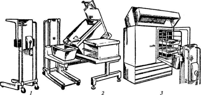 10. Чому склад овочів має бути без природного освітлення? 11. З'ясуйте призначення тари. 12. Складіть схему класифікації тари. 13. Для чого призначені функціональні місткості? 14. Розкажіть про інвентар та інструменти для відкривання тари. 15. У якій послідовності відкривають бочки? 16. Як зберігають тару? 17. Складіть схему класифікації цехів. 18. Що називається робочим місцем? 19. Які бувають робочі місця? Дайте їм характеристику. 20. Як розміщують інвентар на робочому місці? Рис. 5. Функціональні місткості та засоби їх переміщення: 1 — візок ТП-80 з підйомною платформою; 2 — розвантаження електросковороди, З — завантаження пароварильного апарата.