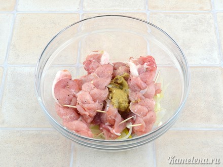 Отбивные из свинины в виде косички, маринованные в горчице и лимонном соке. Ингредиенты: · 500 г свинины · 100 г лука · 1 ч.л. горчицы · половина лимона · соль · перец · мука для обваливания · растительное масло для жарки