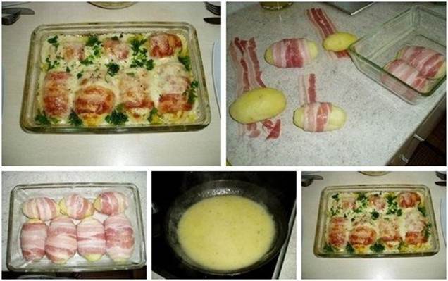Ингредиенты: ●8-10 картошек средней величины (не крупных) Приготовление: Картошку помыть и сварить в мундире,немного остудить и очистить.по две полоски бекона разложить на столе и завернуть в них каждую из картошек, положить в форму и поставить в разогретую духовку (200°) на 10 минут.