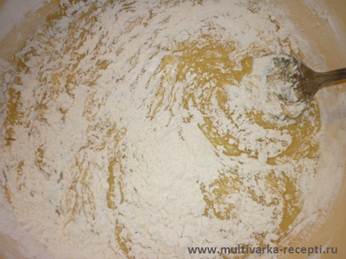 3. Вылить к растопленному маргарину взбитые яйца с сахаром, добавить ванилин и соль. 4. Перемешать. 5. Постепенно ввести муку с разрыхлителем. Замесить мягкое тесто (муки может понадобиться чуть больше). Можно по возможности добавить муки больше нормы так на 100 – 200 грамм.