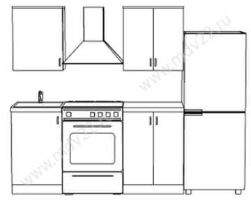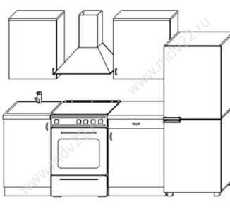 Описание: комплект мебели для кухни из четырёх предметов. Тумба под накладную мойку 50 см, стол-тумба 60 см, шкаф с посудосушителем и шкаф с полкой. Ширина: 1100мм (размер указан без учёта бытовой техники) Высота: низ - 850мм; верх - 574, 717 или 907 мм
