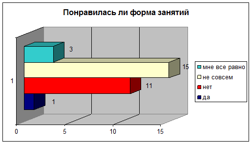 Из приведенной диаграммы видно, что содержание лекций устраивало почти всех слушателей, преподаватели смогли активизировать аудиторию, материал излагался подробно, методическая подготовка была достаточной. Не устраивала слушателей лишь форма проведения занятий, актуальность излагаемого материала была невысокой. 9. Курс обучения показался большинству слушателей очень длинным (22 человека). Курс был по времени оптимальным—так считают 8 человек. 10. У большинства слушателей не было никаких вопросов(11 человек), не совсем достаточной была информация для 7 человек, курс обучения совсем не ответил на вопросы 8 слушателей, и лишь 4 человека из опрошенных считают, что полностью смогли найти ответы на свои вопросы. 11. Среди форм контроля обучения преобладает тестовый контроль и устный экзамен.