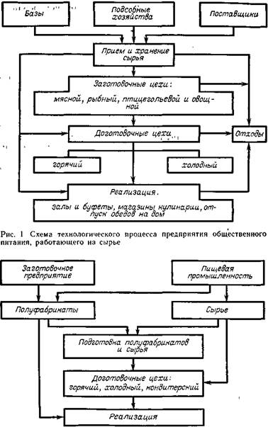 В Основных направлениях экономического и социального развития СССР на 1986 – 1990 годы и на период до 2000 года, принятых XXVII съездом КПСС, предусмотрено опережающими темпами развивать общественное питание, совершенствовать организацию работы, укреплять материально-техническую базу этой отрасли. Важнейшей задачей развития общественного питания на современном этапе является внедрение индустриальной технологии производства продукции на основе кооперации с отраслями пищевой промышленности, создания крупных заготовочных предприятий по выпуску полуфабрикатов и продукции высокой степени готовности и централизованного снабжения ими предприятий общественного питания. Это позволит существенно повысить производительность труда работников отрасли, улучшить качество выпускаемой продукции, рационально использовать сырье и механизировать трудоемкие технологические процессы. Качество продукции, выпускаемой предприятиями общественного питания, здоровье и работоспособность людей во многом зависят от мастерства поваров, от того, насколько они овладели передовой технологией и современной техникой. Технология приготовления пищи – кулинария – изучает рациональные способы механической и тепловой обработки продуктов в целях приготовления блюд и кулинарных изделий в условиях массового производства. Она основывается на традициях народной кухни, опыте поваров-профессионалов, достижениях науки и техники. Производство кулинарной продукции на современном предприятии общественного питания – сложный технологический процесс, который состоит из ряда последовательных операций по обработке продуктов, приготовлению блюд и кулинарных изделий. Блюдо – это сочетание пищевых продуктов, доведенных до кулинарном готовности, порционированных, оформленных и готовых к употреблению в пищу. Кулинарного изделие – пищевой продукт или сочетание продуктов, доведенных до кулинарной готовности, но требующих незначительной дополнительной обработки в виде разогрева, порционирования и оформления. В зависимости от организации технологического процесса предприятия общественного питания подразделяют на работающие на сырья и доготовочные, работающие на полуфабрикатах. Сырьем называют продукты, предназначенные для приготовления блюд; полуфабрикатами – продукты, прошедшие одну или несколько стадий кулинарной обработки без доведения до кулинарной готовности, предназначенные для дальнейшей обработки и изготовления блюд и кулинарных изделий и непригодные к непосредственному потреблению. В зависимости от способа обработки полуфабрикаты могут иметь различную степень готовности. Полуфабрикатом высокой степени готовности называют полуфабрикат, прошедший частичную, или полную механическую, или тепловую, или химическую обработку, а также сочетание полуфабрикатов, из которых в дальнейшем при минимальном количестве технологических операций получают блюдо или кулинарное изделие. Предприятия, работающие на сырье (рис. 1), т. е. с законченным технологическим циклом, должны иметь складские помещения, заготовочные цехи для механической кулинарной обработки продуктов (мясной, рыбный, овощной) и доготовочные цехи – горячий, холодный, кондитерский. Доготовочные предприятия (рис. 2) получают различные полуфабрикаты от промышленности или заготов
