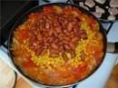 Ингредиенты: - Куриное филе - 500 г. - Помидоры - 2-3 шт. - Сладкий перец - 2-3 шт. - Морковь - 2-3 шт. - Кукуруза (консервированная, замороженная, свежая - на вкус) - 350 г. - Красная фасоль (консервированная, замороженная, свежая - на вкус) - 350 г. - Репчатый лук - 2 шт. - Соль - Растительное масло - Корица - Сушеный чеснок - Сушеная паприка - Сушеный молотый томат - Молотый перец чили Приготовление: 1. Лук порезать полукольцами и положить на разогретую сковороду, смазанную растительным маслом. Немного обжарить на небольшом огне. 2. Морковь порезать кубиком и добавить к луку. 3. Сладкий перец очистить от семян, порезать четвертькольцами, добавить к обжаривающимся овощам. 4. Помидоры порезать четвертькольцами, добавить к обжаривающимся овощам 5. К овощам добавить кукурузу (если используется консервированная, то необходимо предварительно слить жидкость). 6. К овощам добавить красную фасоль (если используется консервированная, то необходимо предварительно слить жидкость). На этом этапе необходимо посолить блюдо и добавить специи (я кладу по половине чайной ложки корицы, сушеного чеснока, сушеной паприки, сушеного молотого томата и около трети чайной ложки молотого перца чили). 7. Куриное филе порезать на среднего размера куски и добавить к овощам. Тщательно перемешать, чтобы курица "потонула" в овощном соусе. После этого потушить блюдо около 10 минут.